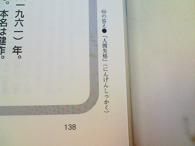 ![]() 島内 景二 著 内容キーワード 「新書」 「国語」 教科書の文学が、こんなに泣ける、せつない、情けない…なんて思わなかった! わずかな成功例と無数の失敗例に、人生を学ぼう。 古典から漱石まで、お堅いイメージが一変する一冊。 (「BOOK」データベースより) ちくまプリマー新書はとっても読みやすいです。 そして、語り口がやわらかいです。 『教科書の文学を読みなおす』なんてどう考えてもつまらなそうに思えるタイトルですが、 帯には「こんなにも美しく切なく・・・教科書で、泣く。」 第一章 人間は、いつも恋をしてきた---『それから』 第二章 若者は、なぜ旅に出るのか?---『坊っちゃん』 第三章 悲しみは、時空を越える---『舞姫』 第四章 人生は、「仮の宿り」である---『草枕』 第五章 自分の幸福は、他人の不幸?---『山椒大夫』 ちょっと読みたくなるでしょう。 『重力ピエロ』(伊坂 幸太郎 著)でも、『山椒大夫』は出てきてましたよね。 スタンダードとなった文学はきっと楽しいに違いない。 なんちゃって文学通検定1 ![]() なんちゃって文学通検定2 明治書院編集部 [編] あなたの「文学通」のレベルを判定する、ヒントつきの検定問題集! なんちゃってのノリ(?)で、クイズ式検定に挑戦あれ。 (「BOOK」データベースより) この本・・・なんちゃってとか言ってるが、かなり難しいと思う。 さすが明治書院・・・(謎) なんちゃって検定問64 「神様みたいないい子」と呼ばれた子が、「道化」を身につけ、いつか廃人になっていく様を描いた作品とは?[昭和23(一九四八年)発表] ヒントもある、なんちゃって豆知識もある。 Bibliothekarinはこの物語を読んだことがある。 そして次のページをめくると答えが。 小さいよ!!! |